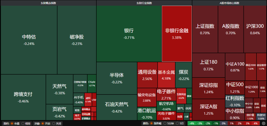 昨日三大指数集体走强,沪指涨0.70%,深证成指涨1.08%,创业板指涨1.36%。沪深两市成交额超过1.7万亿。行业板块呈现普涨态势,保险、贵金属、有色金属、包装材料、小金属、电网设备、航天航空、通信设备、多元金融、证券板块涨幅居前,银行板块跌幅居前。