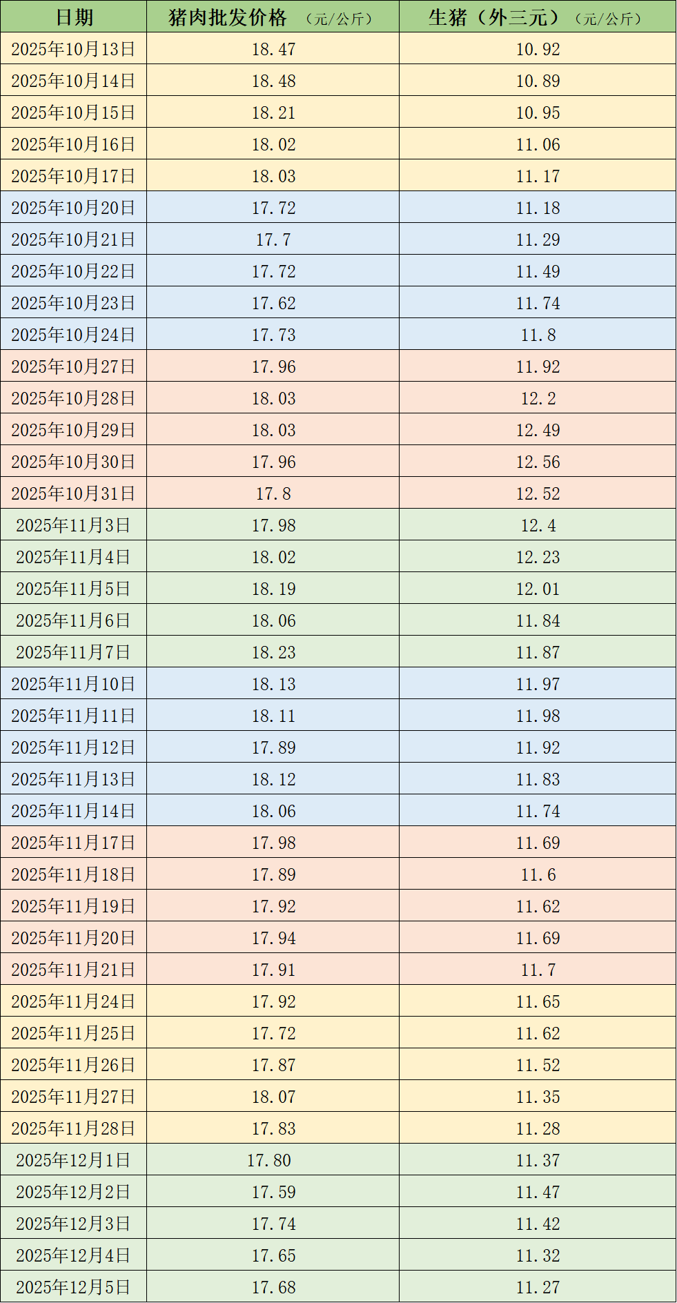 据农业农村部监测,12月5日,全国农产品批发市场猪肉平均价格为17.68元/公斤,与上周五(11月28日)的17.83元/公斤相比,下降0.8%。本周的平均价格为17.69元/公斤,与上周17.88元/公斤的均价相比,下降1.1%。