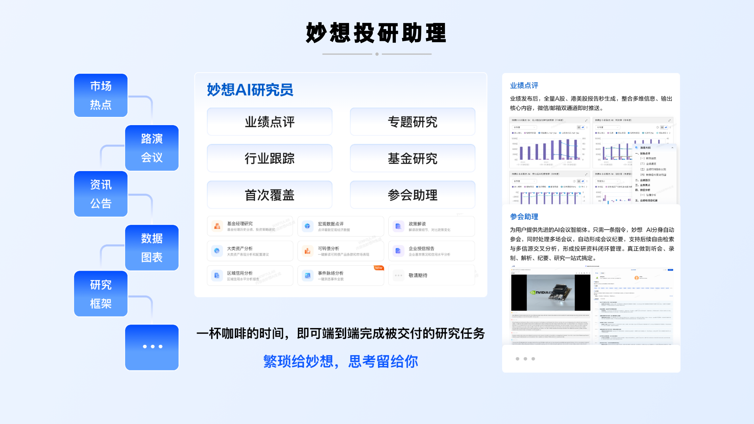在妙想投研助理中打造的“AI研究员”实现全市场自动化覆盖:无论是业绩点评还是专题研究,系统可在数分钟内完成深度研究报告生成,并通过订阅式推送机制,精准触达投资者与专业研究人员,打破传统投研的时间与空间限制。