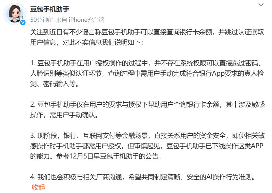 每经AI快讯,12月6日,豆包手机助手在官方微博发文称,关注到近日有不少谣言称豆包手机助手可以直接查询银行卡余额,并跳过认证读取用户信息,对此不实信息我们说明如下:1. 豆包手机助手在用户授权操作的过程中,并不存在系统权限可以直接跳过密码、人脸识别等类似认证环节,查询过程中需用户手动完成符合银行App要求的真人检测、密码输入等。2. 豆包手机助手仅在用户的要求与授权下帮助用户查询银行卡余额,其中涉及敏感操作,需用户手动确认。3. 现阶段,银行、互联网支付等金融场景,直接关系用户的资金安全,即便相关敏感操作时手机助手都需用户授权,但审慎起见,豆包手机助手已下线操作这类APP的能力。