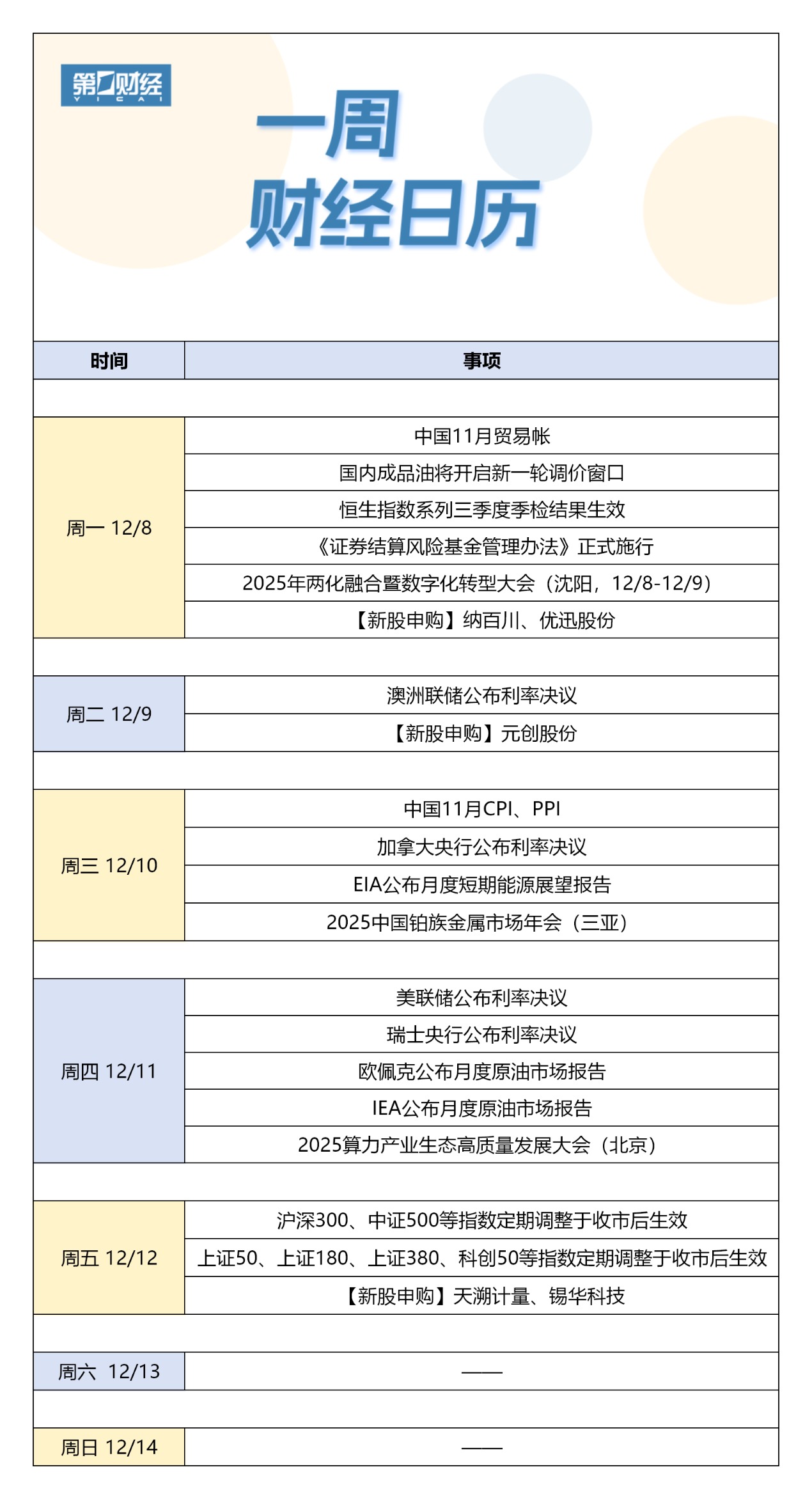 【下周财经日历】12月8日-12月14日