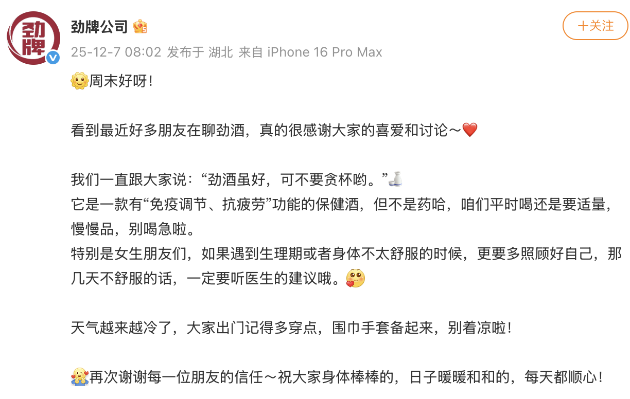 劲酒缓解痛经的说法也引发网友争论,在连续登上热搜后。12月7日,劲牌公司在微博账号回应称,“它是一款有‘免疫调节、抗疲劳’功能的保健酒,但不是药,平时喝还是要适量。”回应中并未明确经期能否饮用问题,仅提到,“女生朋友们,如果遇到生理期或者身体不太舒服的时候,更要多照顾好自己,那几天不舒服的话,一定要听医生的建议。”