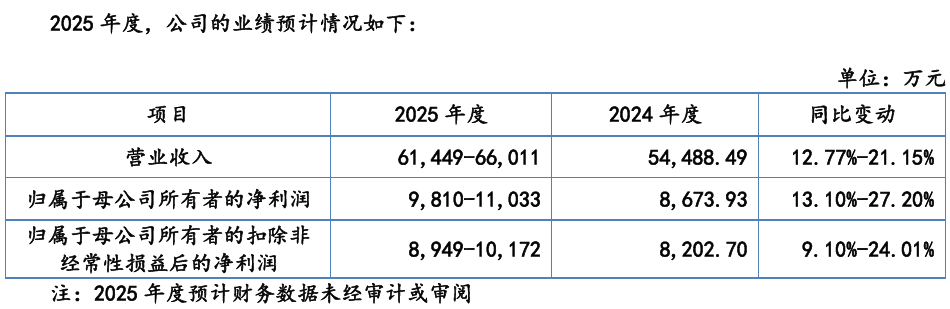 2025年度,公司预计实现的营业收入为61,449-66,011万元,同比增长12.77%-21.15%;归属于母公司所有者的净利润为9,810-11,033万元,同比增长13.10%-27.20%;归属于母公司所有者的扣除非经常性损益后的净利润为8,949-10,172万元,同比增长9.10%-24.01%。上述2025年度预计财务数据未经申报会计师审计或审阅,不构成公司的盈利预测或业绩承诺。