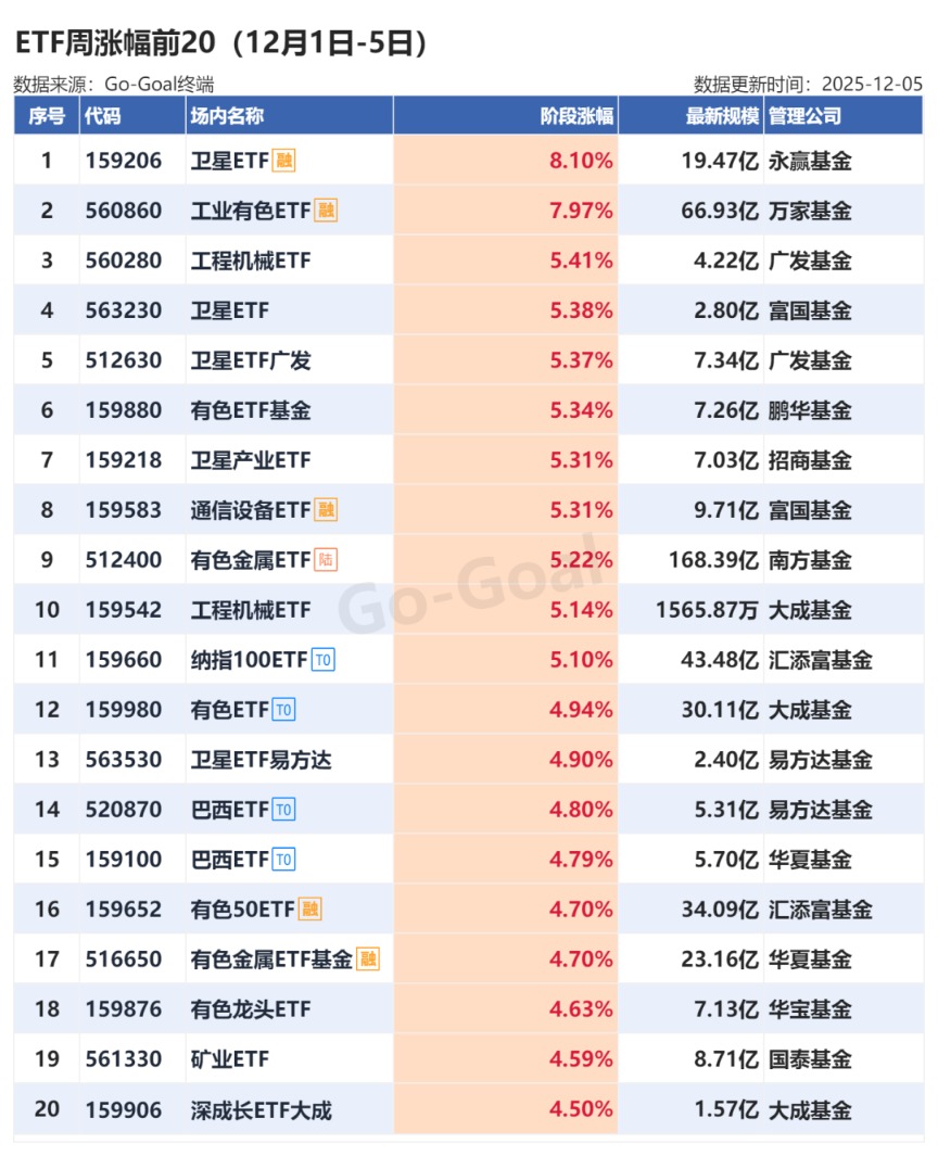 Go-Goal ETF数据显示,本周,商业航天概念爆火,卫星ETF涨幅居首。此外,工业有色、工程机械等相关ETF涨幅居前。跌幅方面,科创新能源、线上消费、酒相关ETF跌幅较深。