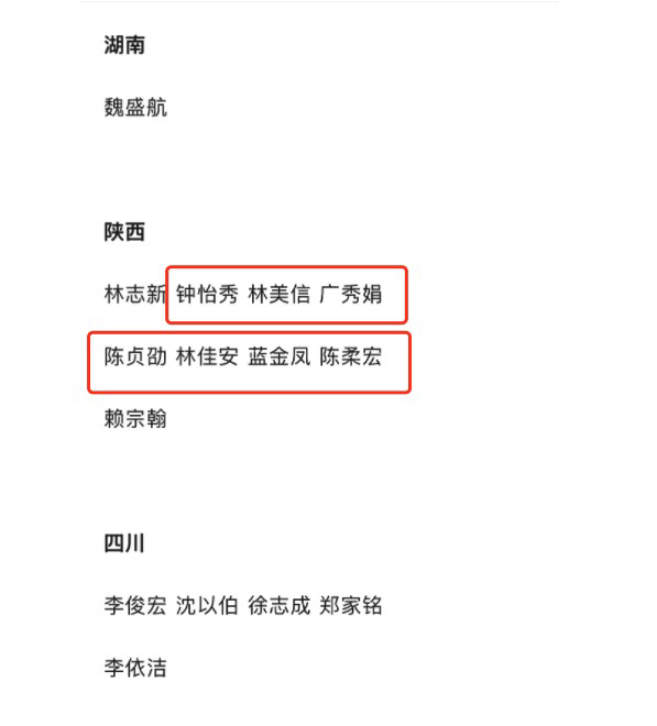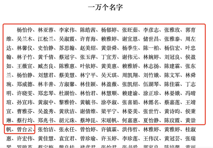 在公示的获奖名单中,特等奖80名获奖者中,大量姓名与网传文档《一万个名字》高度重合。例如:广西12名获奖者中,除前四人外,后续“谢思翰、李嘉宜、蔡绍吉、蔡家维、潘紫友、林丽怡、韩桂谕、杨美慧”8人姓名及排列顺序与文档完全一致;陕西9名获奖者中,“林志新、钟怡秀、林美信、广秀娟、陈贞劭、林佳安、蓝金凤、陈柔宏、赖宗翰”所有人名均与文档重合,其中7人顺序也一致。