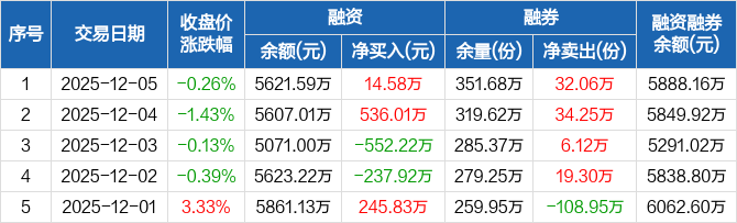 旅游ETF:融资净买入14.58万元,融资余额5621.59万元(12-05)