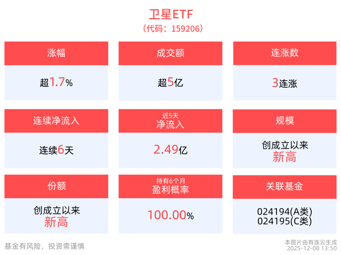 流动性方面,卫星ETF盘中换手29.36%,成交5.91亿元,市场交投活跃。拉长时间看,截至12月5日,卫星ETF近1周日均成交2.62亿元。规模方面,卫星ETF最新规模达19.47亿元,创成立以来新高。份额方面,卫星ETF最新份额达15.13亿份,创成立以来新高。