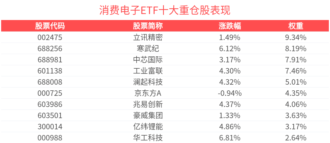 数据显示,截至2025年11月28日,中证消费电子主题指数(931494)前十大权重股分别为立讯精密(002475)、寒武纪(688256)、工业富联(601138)、中芯国际(688981)、京东方A(000725)、澜起科技(688008)、兆易创新(603986)、豪威集团(603501)、东山精密(002384)、亿纬锂能(300014),前十大权重股合计占比56.39%。