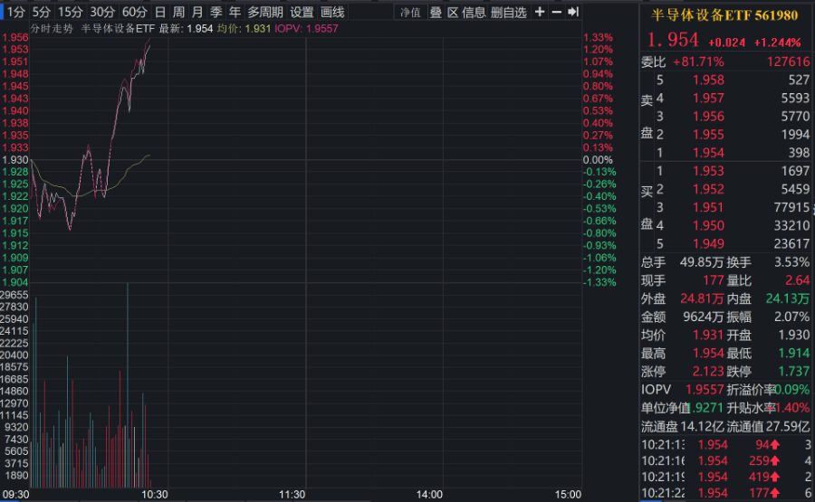 12月8日上午,半导体设备ETF(561980)低开高走盘中拉涨1.24%,成交额达9624万元。成分股中,海光信息大涨超4%,寒武纪涨3.40%,上海新阳、晶升股份、中芯国际等多股走强。资金面显示,该ETF前一交易日“吸金”1725万元,年内份额增幅近94%。
