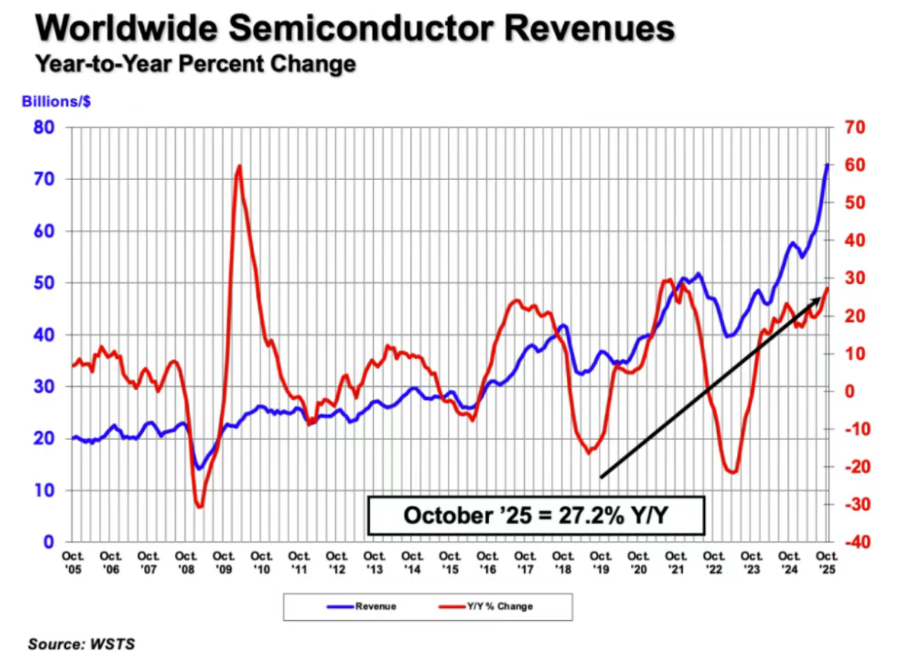 日前,WSTS也发布最新全球半导体市场预测报告指出,预计2025年全球半导体营收将同比增长22.5%至7720亿美元,2026年将进一步增长26.3%逼近1万亿美元大关,主要增长原因是AI与数据中心需求带动逻辑芯片与存储器市场持续火热。