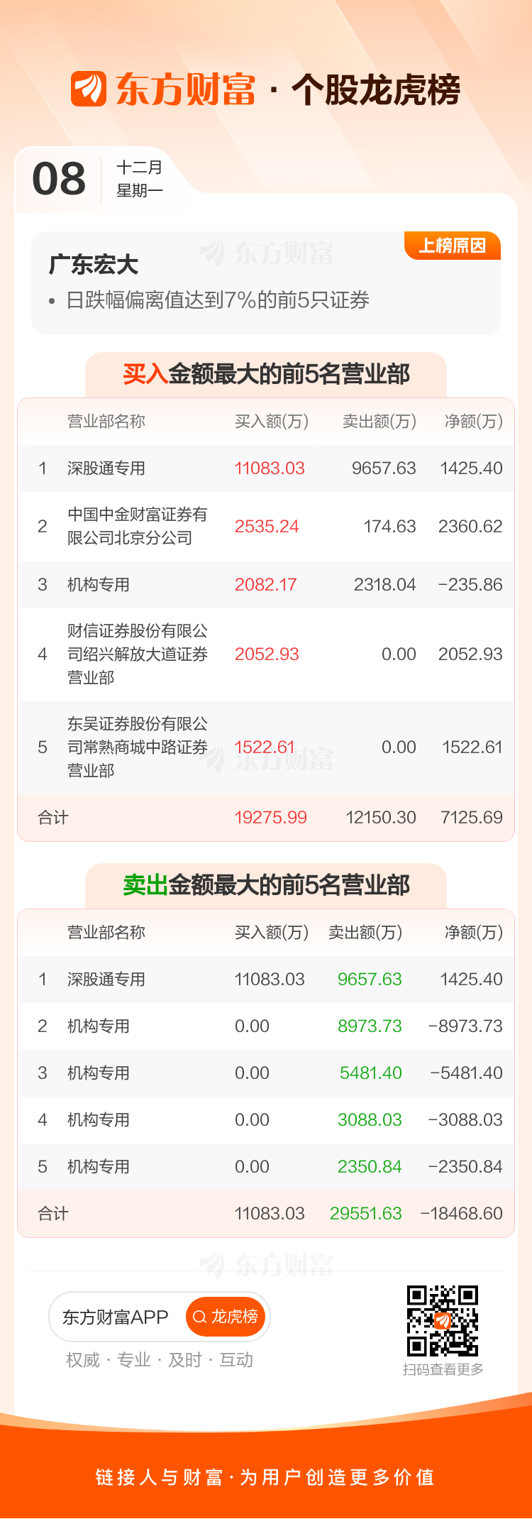 交易所2025年12月8日公布的交易公开信息显示,广东宏大因成为日跌幅偏离值达到7%的前5只证券上榜。广东宏大当日收报39.79元,涨跌幅-5.80%,偏离值-7.02%,换手率4.39%,成交额11.56亿。