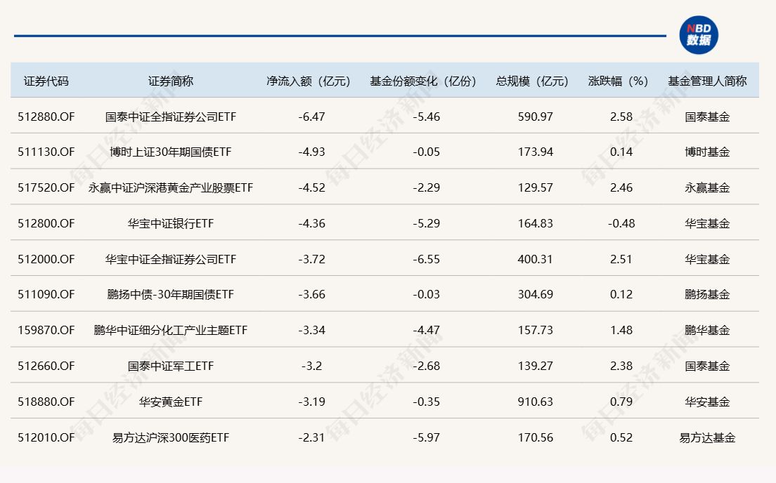 与此同时,国泰中证全指证券公司ETF份额减少5.46亿份,对应净流出6.47亿元;博时上证30年期国债ETF份额减少0.05亿份,录得净流出4.93亿元;永赢中证沪深港黄金产业股票ETF份额减少2.29亿份,出现净流出4.52亿元。