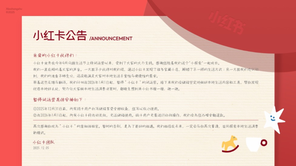12月8日,小红卡团队发布公告,宣布“小红卡”将于2026年1月1日起暂停试运营。接下来将阶段性集中资源,聚焦在本地生活内容影响力,提升本地生活交易产品和工具,“帮用户发现优质本地好去处,努力让大家做本地生活消费决策时,都能先想到来小红书搜一搜、逛一逛”。