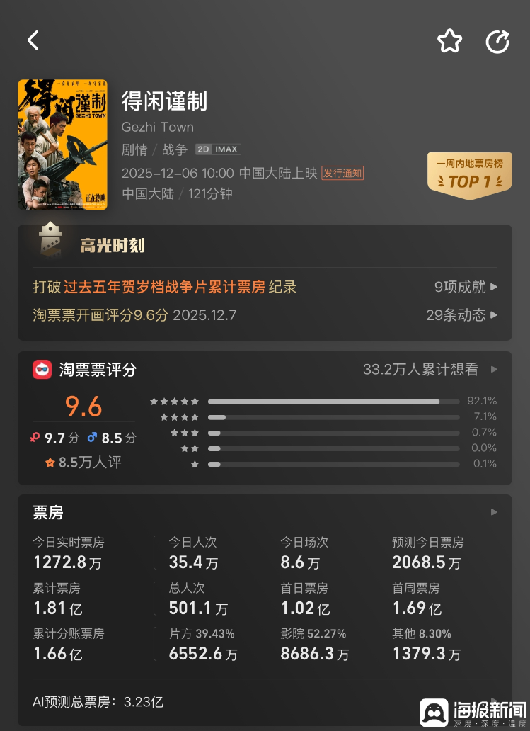 对于票房的爆发,业内人士分析,一方面是贺岁档前期缺乏头部影片,另一方面是《得闲谨制》跳出了战争片的“宏大叙事套路”:“它把‘英雄’拆成了一个个有私心、有软肋的普通人,这种‘落地感’让观众愿意共情。”而淘票票平台的数据也显示,该片“想看用户画像”中,女性受众占比高达93.1%,打破了战争片“男性向”的受众惯性。