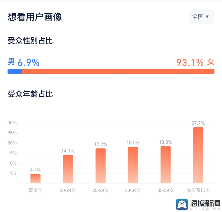 淘票票数据显示,该片“想看数据”中,女性占比高达93.1%,且40岁及以上人群占比27.7%。