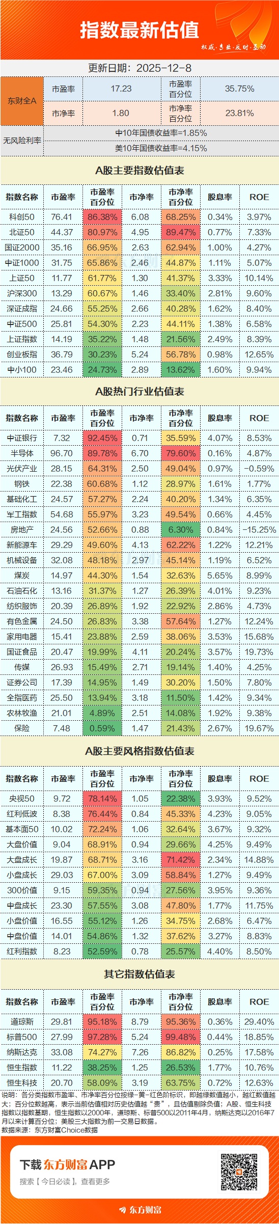 截至12月8日收盘,东方财富Choice数据显示,东财全A市盈率为17.23倍,市盈率百分位为35.75%;市净率为1.8倍,市净率百分位为23.81%。