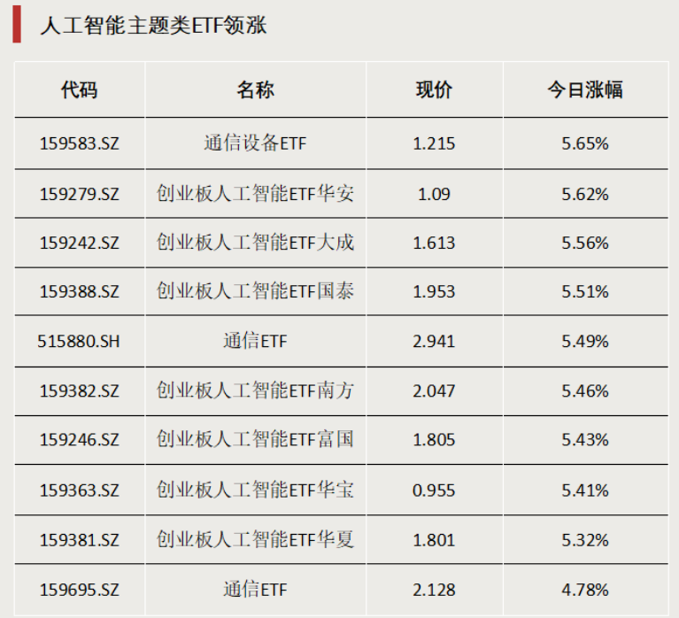 12月8日,A股市场强势上涨。在个股普涨的同时,多只人工智能主题类ETF表现强势,领涨ETF市场。