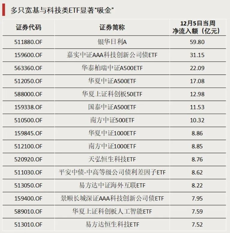 上周(12月1日—12月5日),宽基与科技类ETF显著吸金,多只相关主题ETF单周净流入额超10亿元。