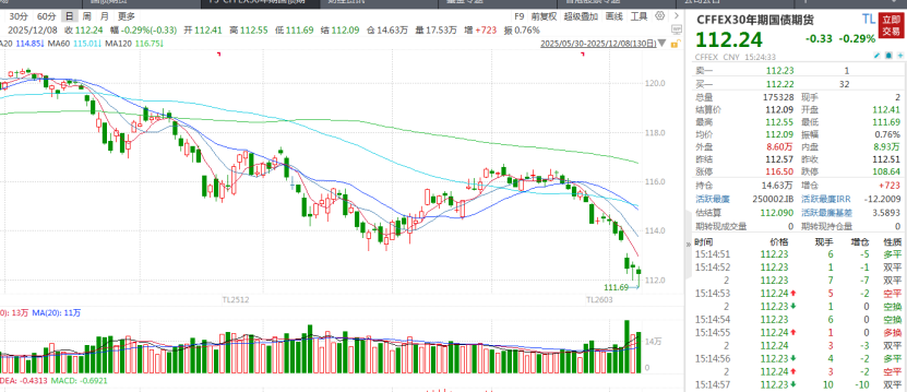 从近期国债期货的表现来看,长端国债期货的价格跌幅更为明显。12月8日盘中,30年国债期货的价格一度跌至111.69元,刷新年内新低。10年期、5年期、2年期国债期货的价格整体处于震荡行情中。
