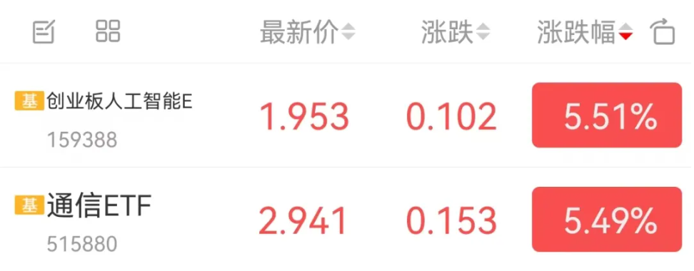 12月8日算力板块表现强势,延续前期上涨势头,创业板人工智能ETF(159388)收涨5.51%,通信ETF(515880)收涨5.49%。