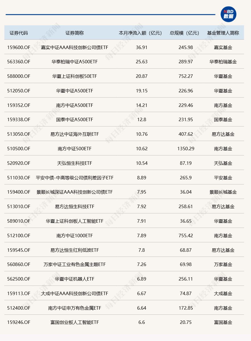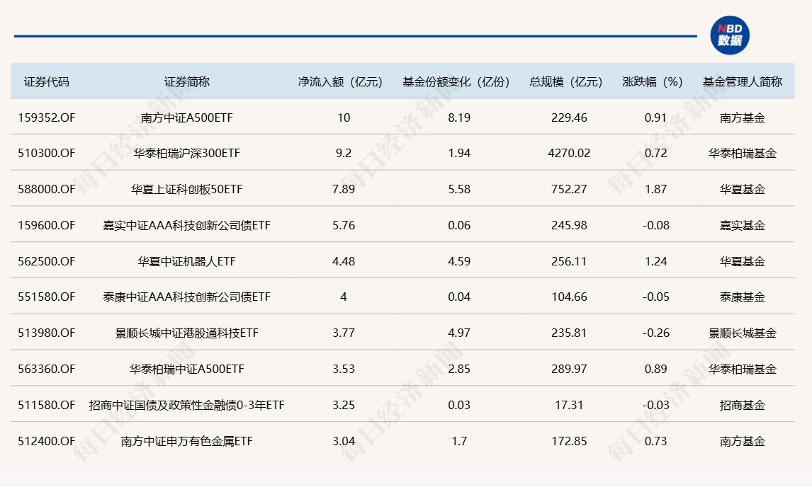 ETF规模速报 | A500ETF南方昨日净流入10亿元,证券ETF净流出逾26亿元