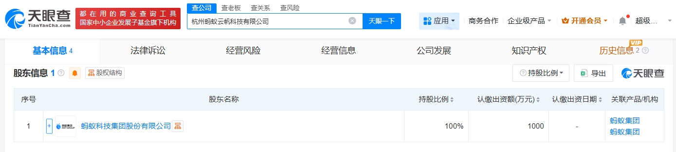 每经AI快讯,天眼查App显示,近日,杭州蚂蚁云帆科技有限公司成立,法定代表人为徐晟薇,注册资本1000万元人民币,经营范围包括企业管理咨询、网络技术服务、计算机软硬件及辅助设备批发、互联网销售等。股东信息显示,该公司由蚂蚁科技集团股份有限公司全资持股。