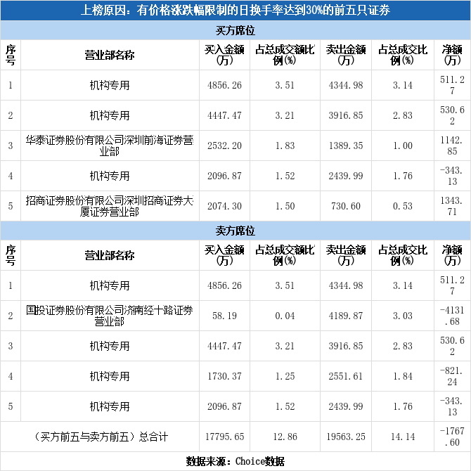 龙虎榜数据显示,今日共7个机构席位出现在龙虎榜单上,分别位列买一、买二、买四、卖一、卖三、卖四、卖五,合计净卖出122.47万元,占龙虎榜净卖额的6.93%。除此之外还有永辉超市、德科立、雷科防务等35只个股榜单上出现了机构的身影,其中17家呈现机构净买入,获净买入最多的是德科立,净买额为2.60亿元;18家呈现机构净卖出,其中遭净卖出最高的为永辉超市,净卖额为3.42亿元。