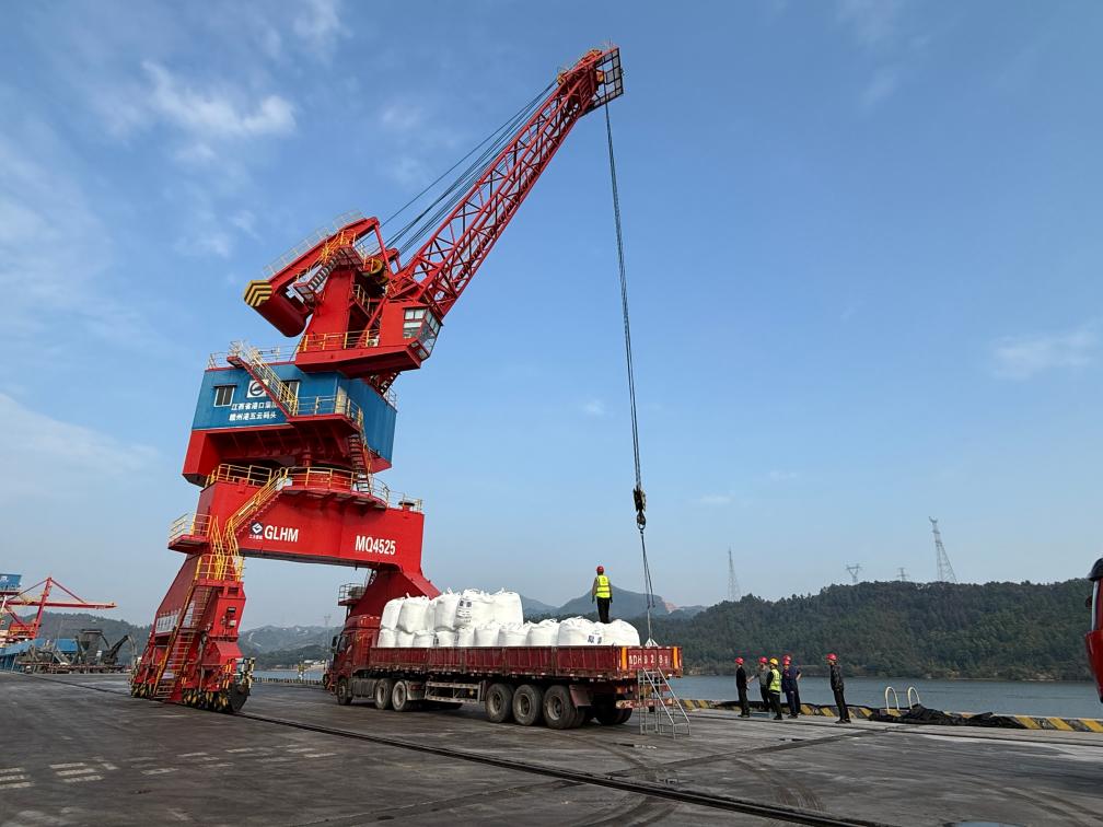 图为赣州港五云综合枢纽码头货物装卸现场。新华社记者朱雨诺摄
