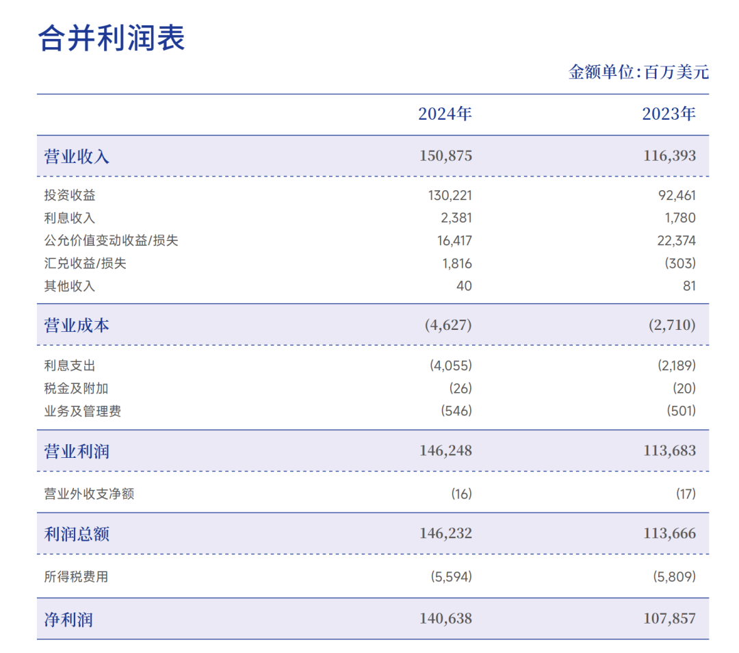 营业收入的增加主要来源于投资收益的大幅增加。数据显示,2024年中投公司实现投资收益1302.21亿美元,同比大增40.8%,占总营收的46.3%。