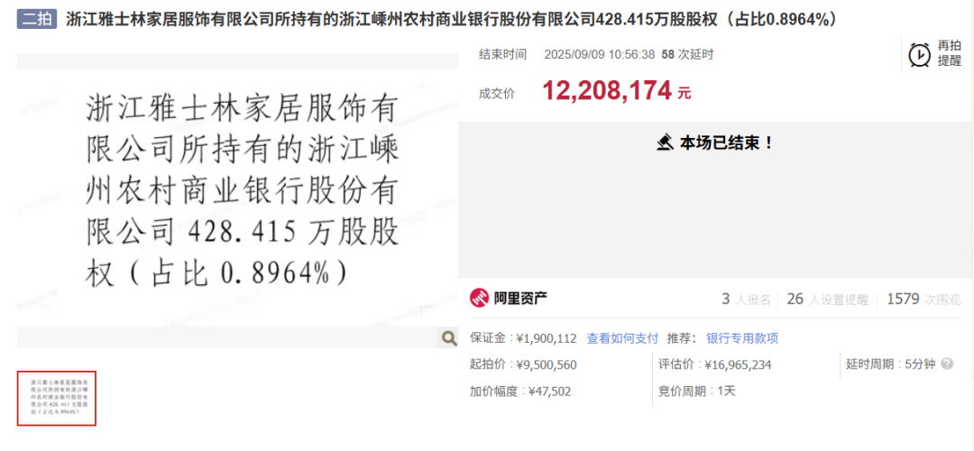 除了前述寿光农商行,今年9月拍卖成功的浙江嵊州农商行428.415万股股权也有类似情况。该笔股权第一次拍卖的起拍价为1187.57万元,已经较评估价打了七折,但最终还是因0人报名无人出价而流拍。第二次拍卖中,这笔股权降价230多万元,起拍价降至950万元。3个竞拍方进行了58次出价,最后以1221万元成交,仍然远低于该标的评估价。