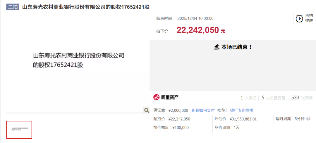 日前,寿光农商行1765.24万股股权在阿里资产司法拍卖平台进行二次公开拍卖。根据拍卖信息,本次拍卖仅有1个竞买记录。
