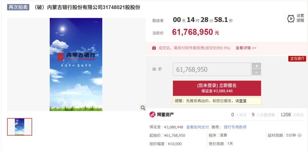 内蒙古银行3174.80万股股份目前正在拍卖,这是该笔股权第四次被摆上拍卖台,起拍价累计降价2100万元,此前三次拍卖均因无人出价而流拍。截至记者发稿,该标的此次拍卖仍是0报名状态。