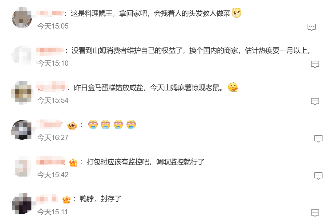 对于此次“麻薯盒内有活老鼠”的事件,网友评论除了玩梗之外,更多的是对山姆品控表示不满。