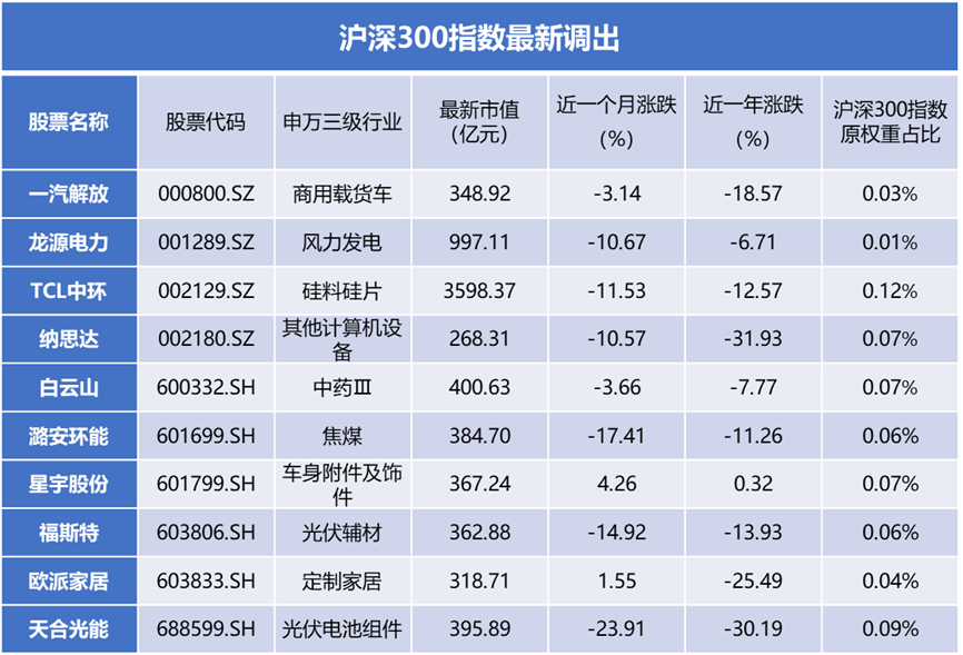 据中证指数公司官网公布,沪深300指数本次更换11只样本,胜宏科技、东山精密、瑞芯微、光启技术、光线传媒、指南针、国联民生等11股新调入指数样本,福斯特、福莱特、TCL中环、潞安环能、一汽解放等11股被调出指数样本。
