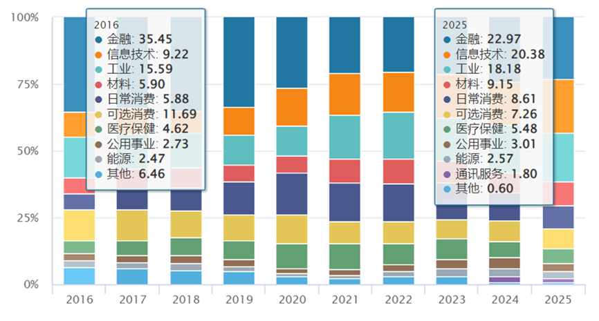 对比2016年和2025年,沪深300指数的行业权重,可以清晰看到:金融行业权重从35.45%降至22.97%;与此同时,信息技术行业从9.22%,大幅增至20.38%。这里的信息技术,就包含了通信、电子、计算机等行业。