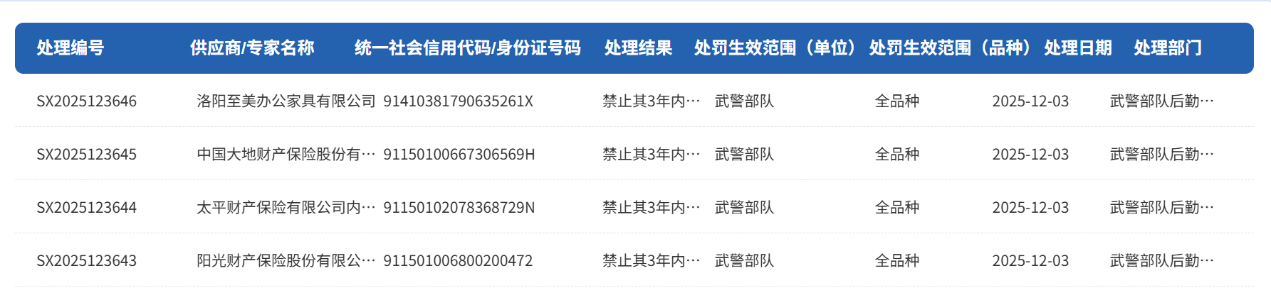 2025年12月3日,军队采购网发布的一则处罚公告,中国大地财险、太平财险、阳光财险三家头部险企的内蒙古分支机构,因在过往采购项目中存在“围标串标”行为,被武警部队后勤部处以“三年内禁止参与武警部队采购活动”的重罚。