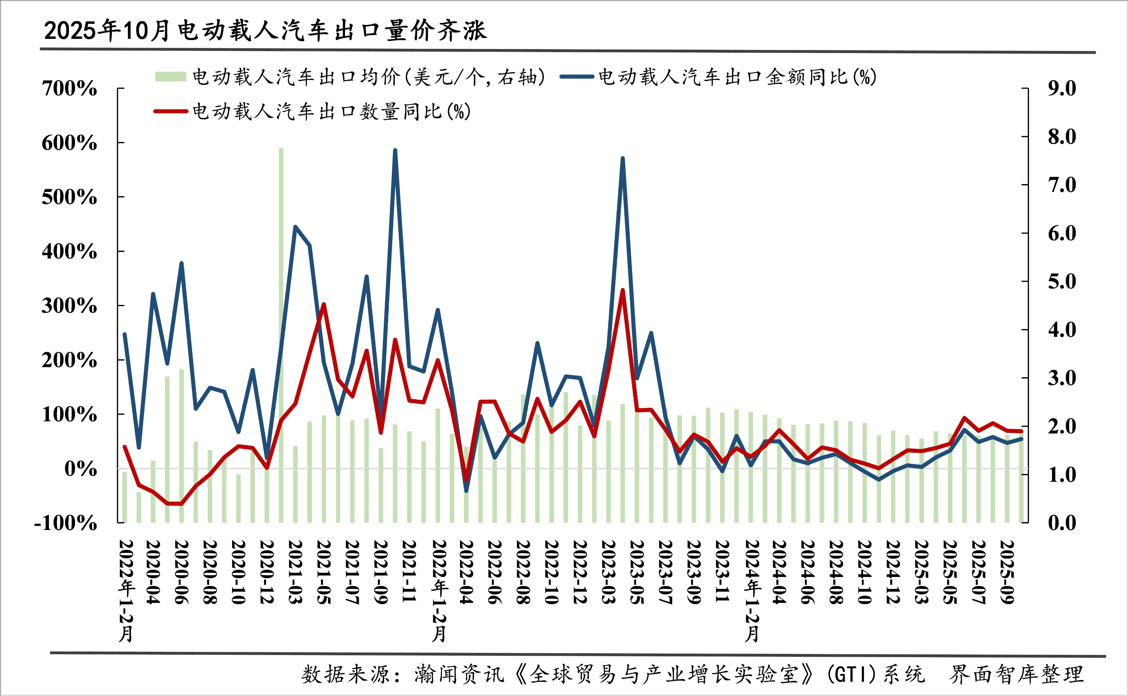 电动载人汽车出口量价齐涨。10月,电动载人汽车出口数量为37.5万辆,环比从下降3.8%逆转为增长8.6%,同比增长68.7%、较上年同期加快59.8个百分点、较9月微降0.5个百分点;出口均价为1.9万美元/辆,环比增长3.5%,同比下降8.6%,降幅较上年同期收窄4.8个百分点、较9月收窄4.6个百分点;出口金额为70.8亿美元,环比从下降3.4%逆转为增长12.4%;同比增长54.3%,较上年同期加快59.9个百分点,较9月加快7.3个百分点。