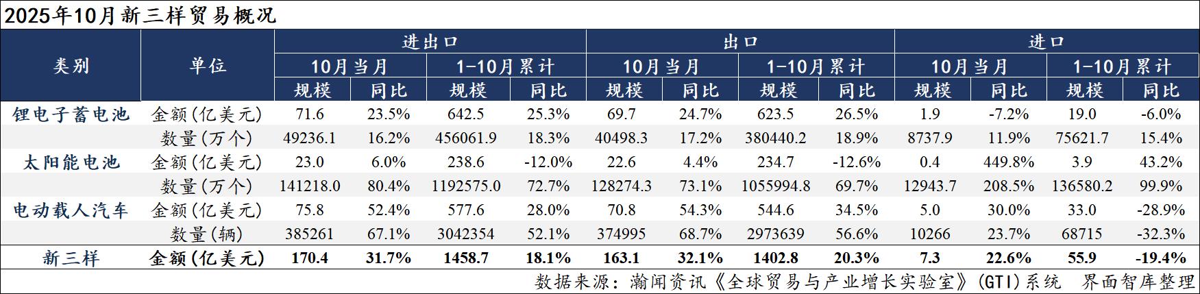 据界面智库和瀚闻资讯统计,2025年1-10月,我国“新三样”进出口总额1458.7亿美元,同比增长18.1%。其中,出口1402.8亿美元,同比增长20.3%;进口55.9亿美元,同比下降19.4%。10月当月,我国“新三样”进出口总额170.4亿美元,环比增长1.3%,同比增长31.7%。其中,在全国出口环同比下降的背景下,“新三样”出口163.1亿美元,环比增长0.7%,同比增长32.1%;进口7.3亿美元,环比增长16.6%,同比增长22.6%。