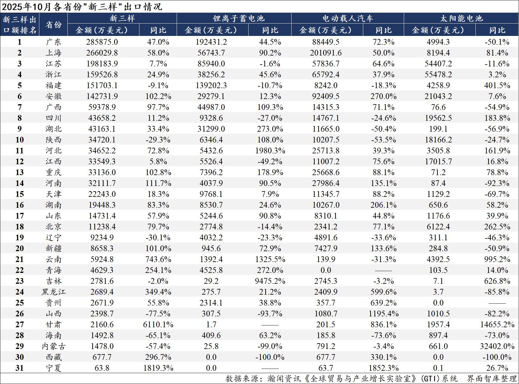 【编者按】为了更全面、更及时、更精确地反映“新三样”产品的出口状况,2025年3月起,界面新闻/界面智库和瀚闻资讯联合推出《中国“新三样”出海月报》。《中国“新三样”出海月报》旨在呈现全国及各省“新三样”产品出口金额、出口数量和出口目的地等指标的月度变化趋势,以期为政府、企业和投资者等提供决策参考。我们将于每月27日左右发布相关月报。