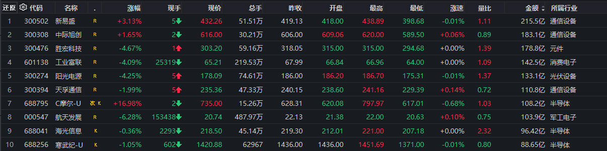 个股方面,新易盛成交额破200亿元,中际旭创、胜宏科技、工业富联等成交额靠前。