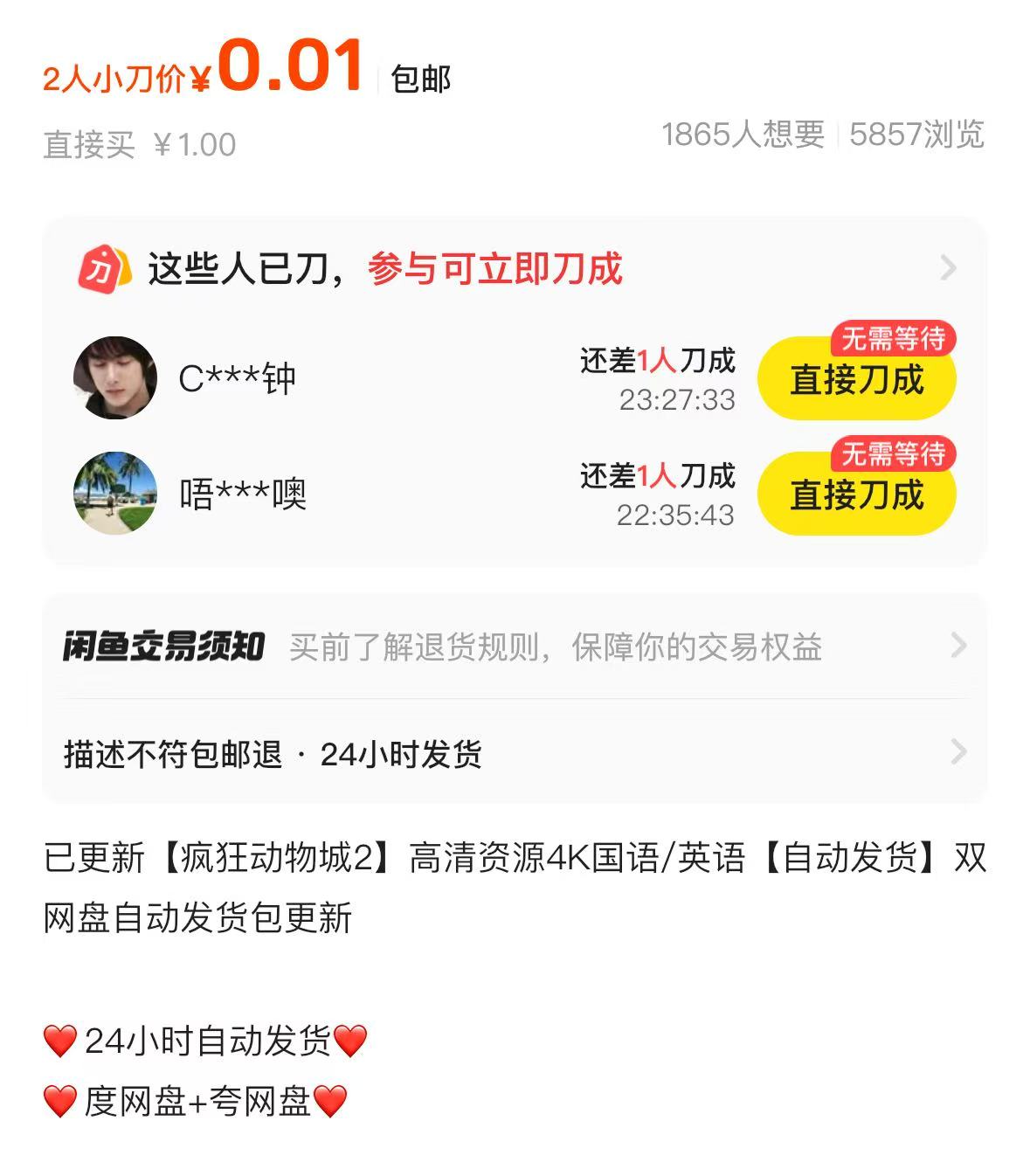 第一财经记者发现,在一些二手商品平台上,不少商家在售卖0.01元的盗版《疯狂动物城2》资源,通常通过网盘传播,且各种语言的4k版本都能获取,还能下载、投屏观看。这些商家将标价设置在0.01元至3元之间,许多商品销量显示已超1000份。
