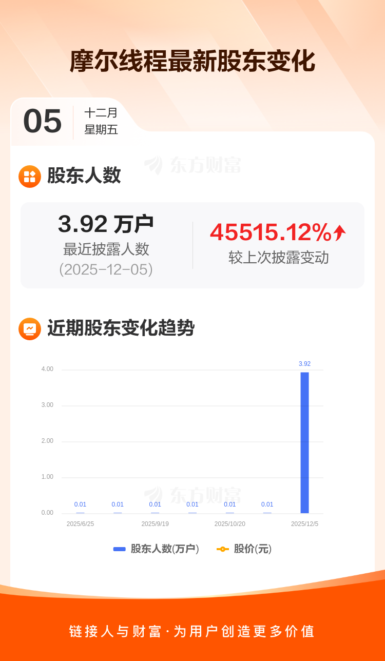 摩尔线程最新披露数据显示,截至12月5日公司股东户数为3.92万户,较上期(2025年11月14日)增加3.91万户,增幅为45515.12%。户均持有流通股数量由上期的null股上升至748股,户均持股金额为null元。