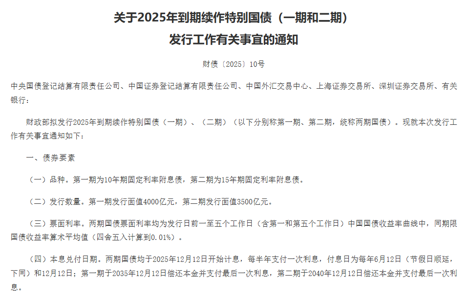 12月10日,财政部发布《关于2025年到期续作特别国债(一期和二期)发行工作有关事宜的通知》,拟于12日在全国银行间债券市场面向有关银行定向发行2025年到期续作特别国债7500亿元,发行过程不涉及社会投资者,个人投资者不能购买。