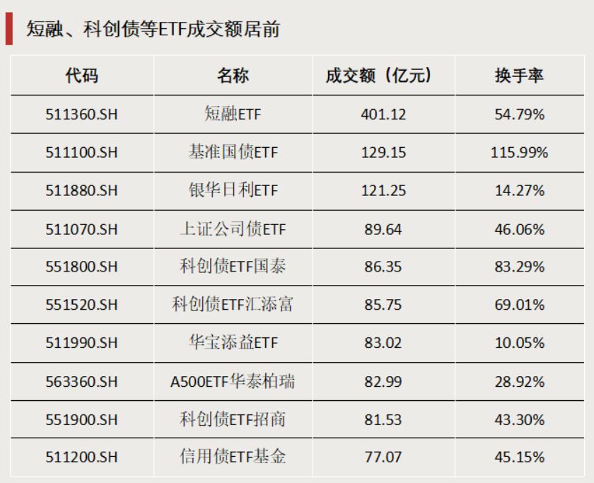 今日,多只债券型ETF交投活跃,短融ETF、基准国债ETF和银华日利ETF等品种今日成交额超100亿元;多只科创债主题ETF今日成交金额超80亿元。