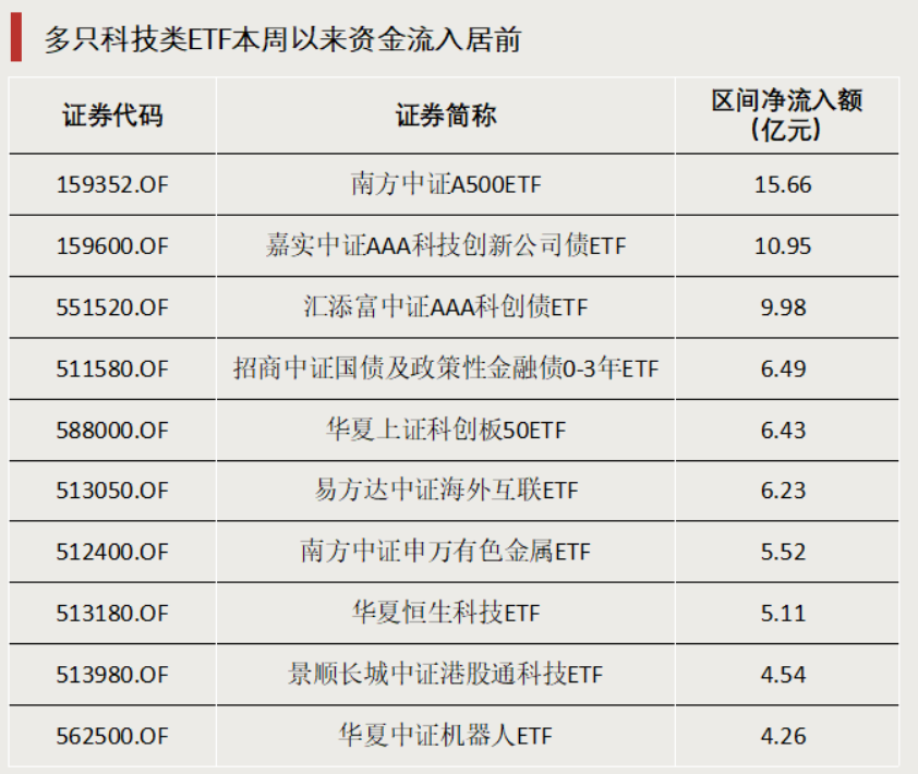 本周,A股市场科技板块反弹,科技类ETF也获得资金持续流入。其中,科创债、科创板代表指数、恒生科技指数等相关ETF明显吸金。宽基指数ETF方面,南方中证A500ETF本周前两个交易日吸金超15亿元,全市场排名第一。