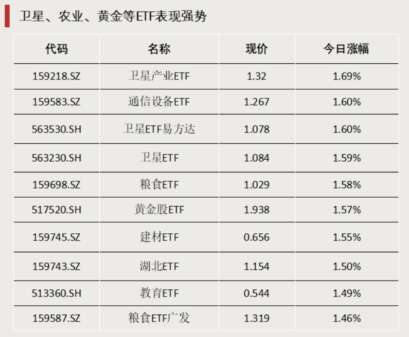 今日,卫星产业相关个股以及部分农业股表现活跃,带动相关主题ETF涨幅居前。