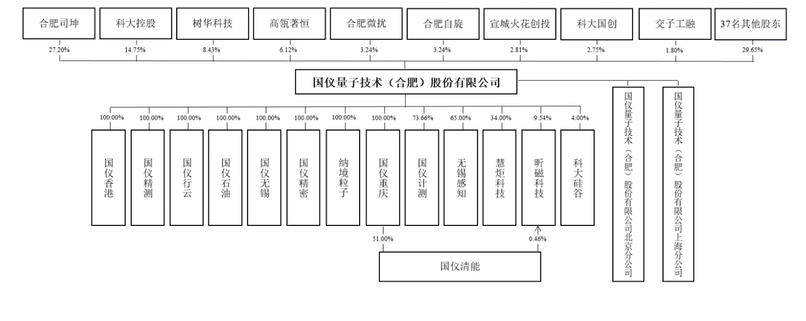 根据公司股本情况分析,合肥司坤、科大控股、树华科技为国仪量子前三大股东,持股比例分别为27.2%、14.75%和8.43%。此外,“科大系”上市公司科大国创持股2.75%,为公司第八大股东;科大讯飞持股1.4%,为公司第十五大股东。公司的实际控制人为贺羽、荣星,二人自2017年7月开始签署一致行动协议,二人不直接持有公司股份,合计控制公司34.87%的表决权。