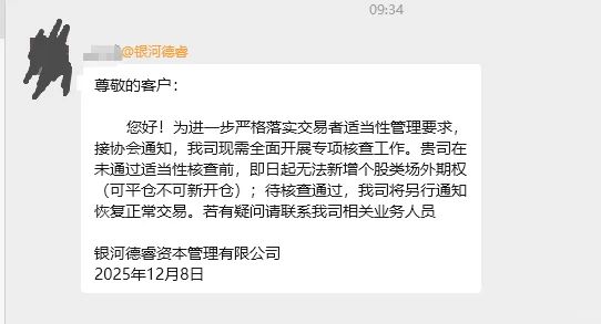 近日,一张关于银河德睿资本管理有限公司(下称“银河德睿”)发送给客户的通知在业内广泛流传。该通知显示,这家期货风险管理子公司为落实交易者适当性管理要求,需开展专项核查,期间将暂停新增个股类场外期权业务,但平仓业务可继续进行。