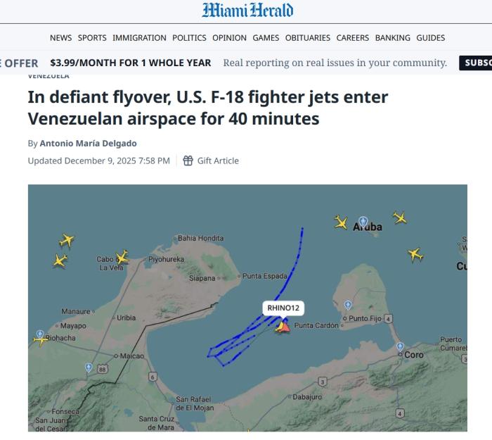 根据FlightRadar24等飞行应用程序显示,美国战斗机留下的飞行轨迹表明,它们在马拉开波湖北部上空、委内瑞拉湾水域上空飞行,飞行路线正好位于委内瑞拉苏利亚州的拉瓜希拉市和法尔孔州首府科罗市之间。