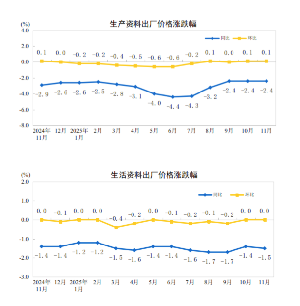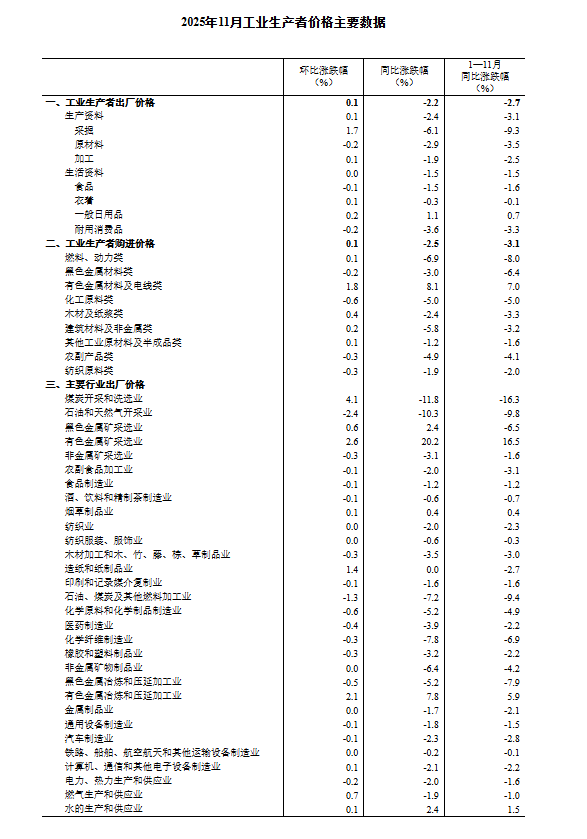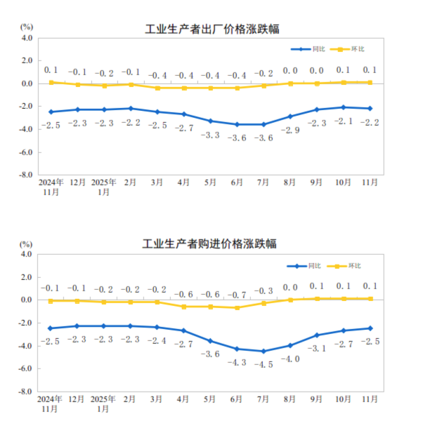 中新网12月10日电据国家统计局网站消息,2025年11月份,全国工业生产者出厂价格同比下降2.2%,工业生产者购进价格同比下降2.5%;工业生产者出厂价格和购进价格环比均上涨0.1%,涨幅均与上月相同。1—11月平均,工业生产者出厂价格比上年同期下降2.7%,工业生产者购进价格下降3.1%。